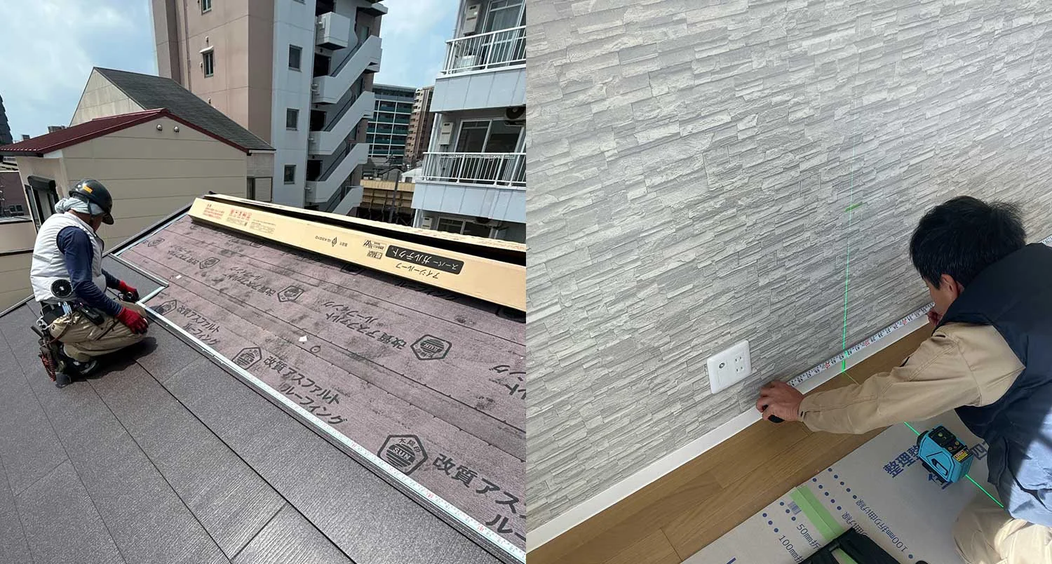 瓦、板金、雨漏り、雨樋、外壁塗装、サイディング、キッチン、風呂、給湯器、壁紙やフローリングなどトータルに対応。部分的な修繕から全面改装まで一貫してお任せいただけます。