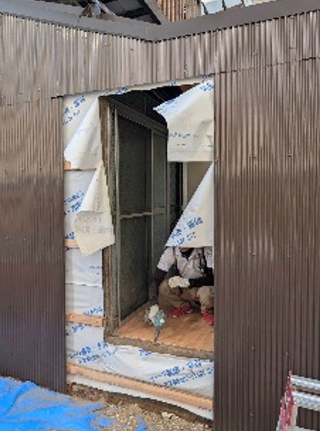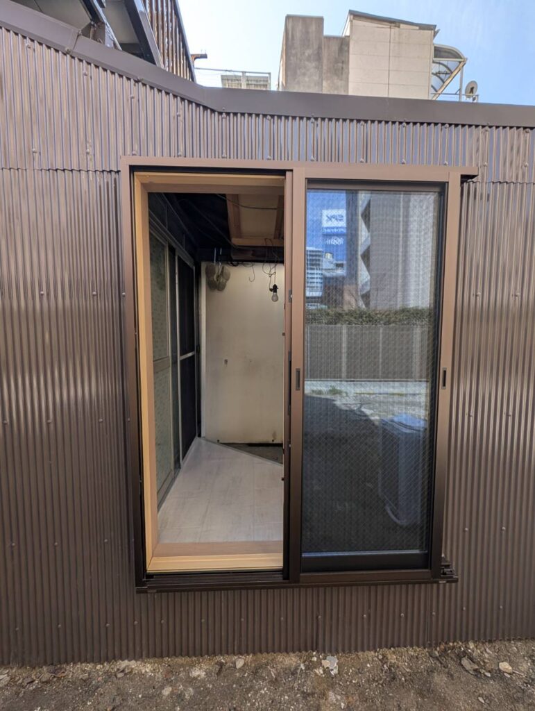 切り離しした外壁に、新たに勝手口を取付、防火仕様の引き戸を提案しました。